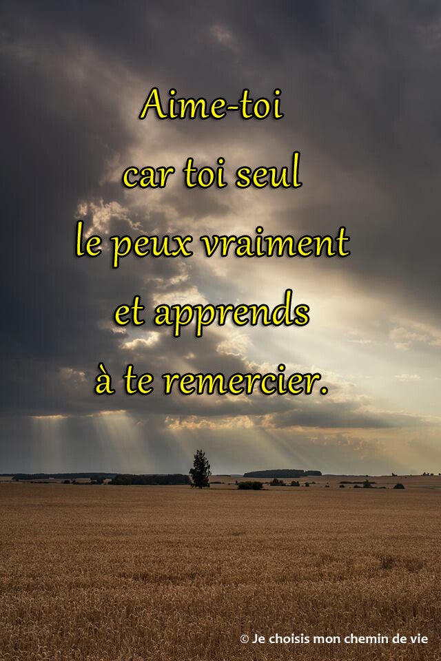 Sois toi-même et aime-toi avec tes défauts et tes imperfections physiques mais surtout pour ta capacité d'amour envers les autres et n'oublie pas de te remercier chaque soir pour ce que tu es et ce que tu fais en te souhaitant une bonne nuit.